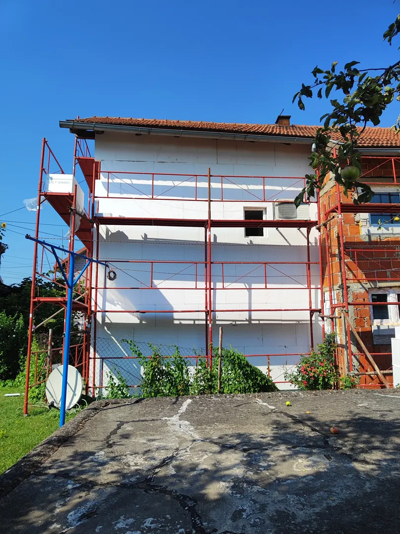 Poštovani, Potrebno mi je napraviti fasadu obiteljske kuće dimenzija 16 x 16 m...Kuća je prizemnica sa potkrovljem. Predviđeno je po projektu postavljanje fasade od stiropora10 cm cokli donji (već postoji), 15 cm, na samu kuću te 5 cm na vijenac oko kuće koji zatvara donji dio krovišta. Hvala i lijep pozdrav